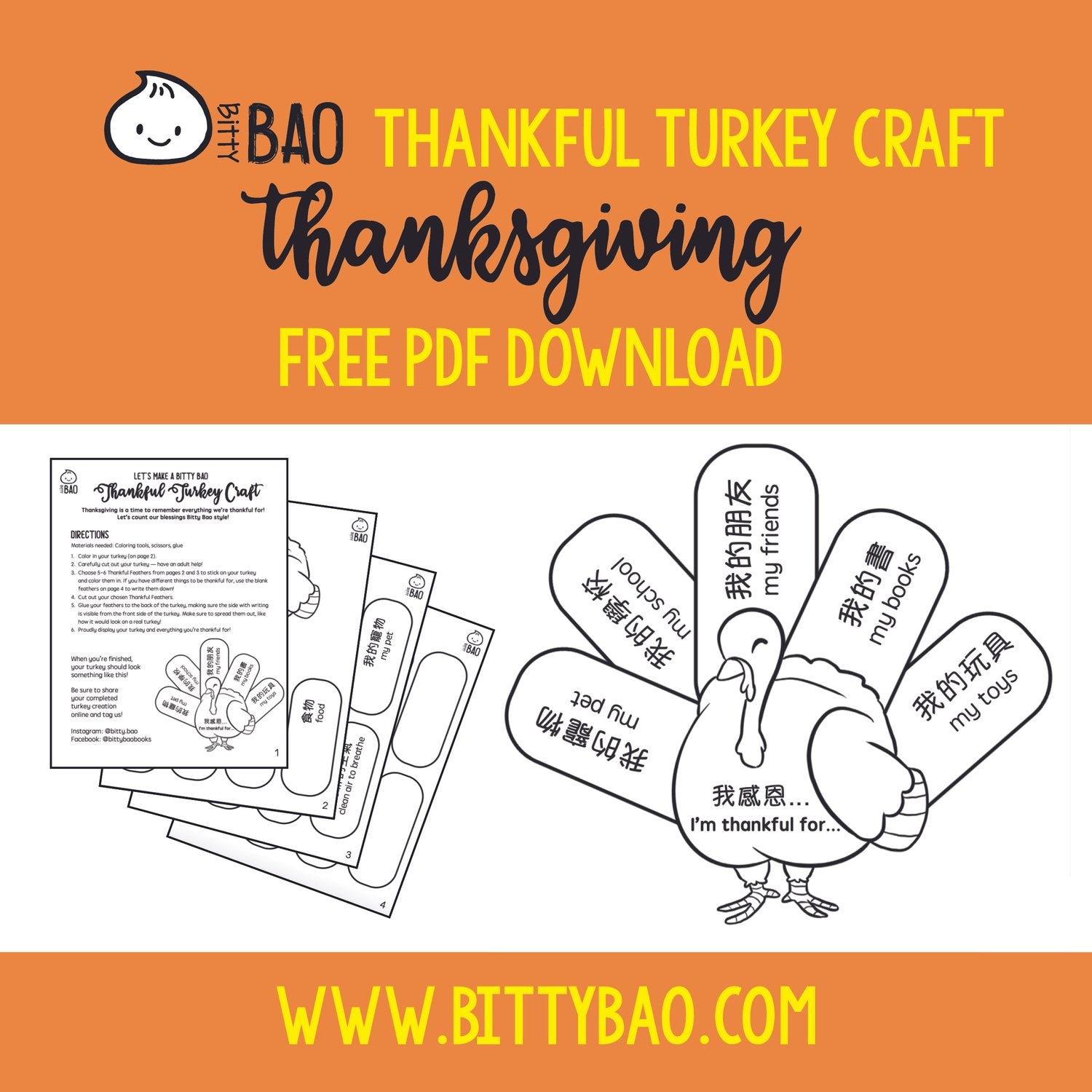 Download a free PDF of the cutest Bitty Bao bilingual turkey craft in celebration of Thanksgiving! A great activity to talk to kids about being thankful and grateful for the things that we have in life.